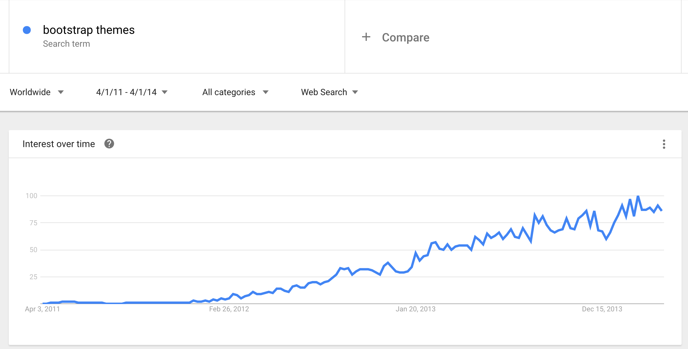One last thing that we did was check whether or not our particular keyword is trending or declining. With a quick search in Google trends, we could see that Bootstrap themes and templates were definitely on the rise. Marc being a developer could also vouch that Bootstrap was a growing community.